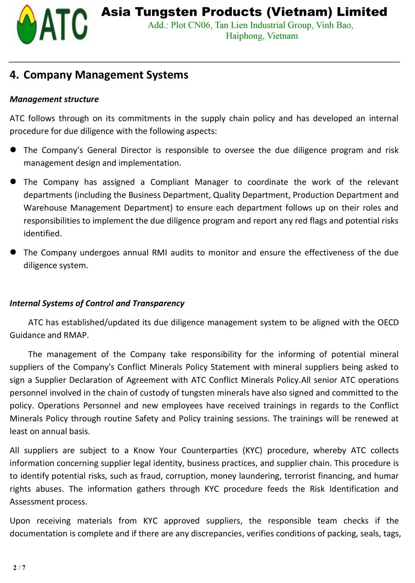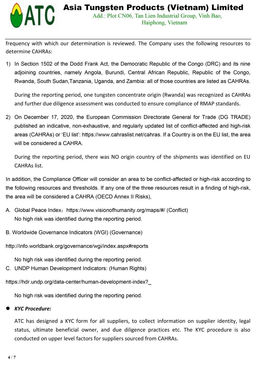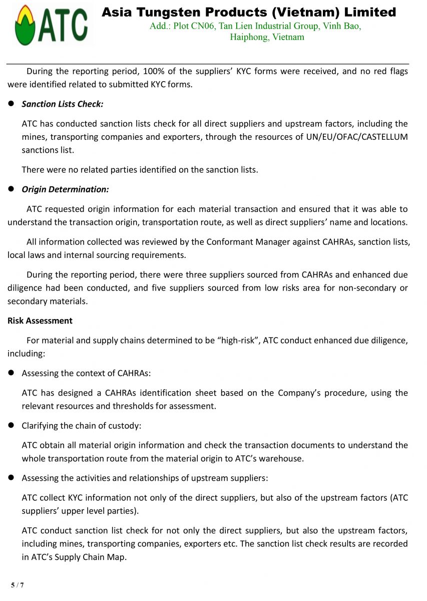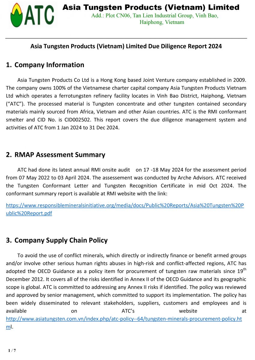 ..Asia Tungsten Products Co Ltd is a Hong Kong based Joint Venture company established in 2009. The company owns 100% of the Vietnamese charter capital company Asia Tungsten Products Vietnam Ltd which operates a ferrotungsten refinery facility located in Vinh Bao District, Haiphong, Vietnam (“ATC”). The processed material is Tungsten and CID No. is CID002502. This report covers the due diligence activities of ATC in the calendar year of 2024....