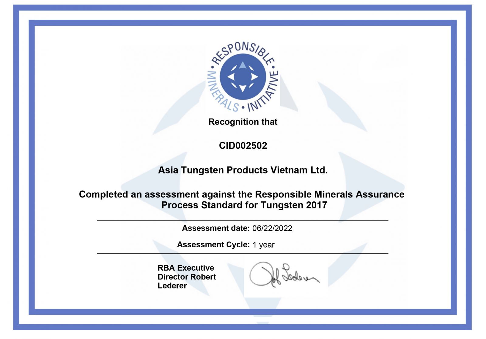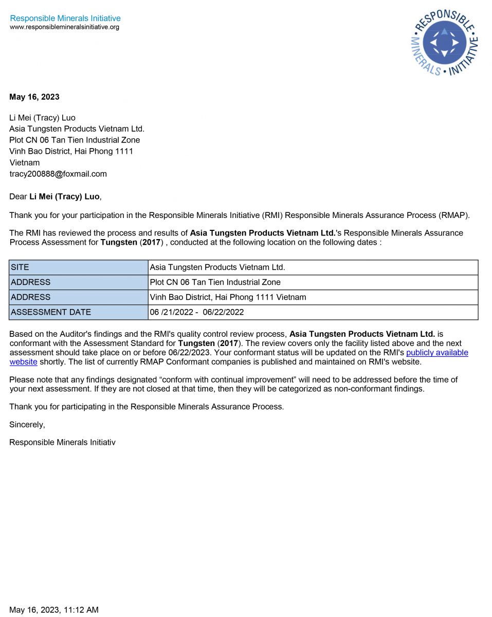 Based on the Auditor's findings and the RMI's quality control review process, Asia Tungsten Products Vietnam Ltd. is conformant with the Assessment Standard for Tungsten (2017).....